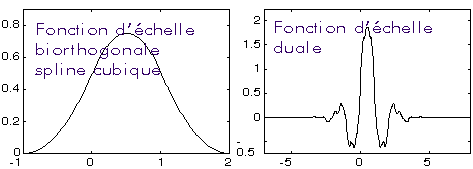 Voici une paire de fonctions d'échelles biorthogonales. La première est un B-spline cubique. Comme on n'a pas de contrainte d'orthogonalité, on peut garder le B-spline comme atome et préserver ainsi symétrie et support compact.