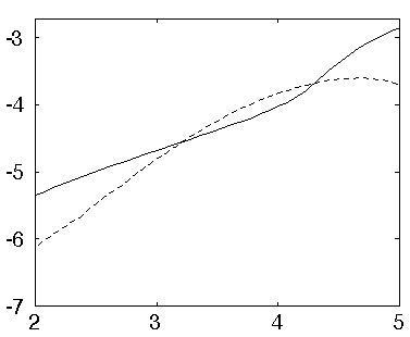 Graphiquement, on trace les modules maximaux en fonction de l'échelle dans un diagramme log-log, et la pente donne l'ordre de singularité estimé. Voici cette courbe pour deux singularités: en trait plein, pour la singularité en t=14, et en pointillés, pour la singularité en t=108. Les échelles fines sont à gauche.